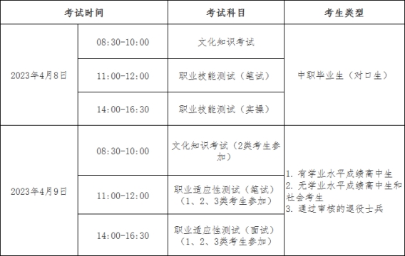 职业适应性测试:普通高中毕业生和以同等学力报考的社会考生需要参加职业适应性测试,分为笔试和面试,笔试主要考察学生的通用技术及有关基础知识、科学素质等;面试主要考察考生的语言表达能力、专业素养、职业潜能和职业倾向等。笔试和面试各100分,总分为200分。
